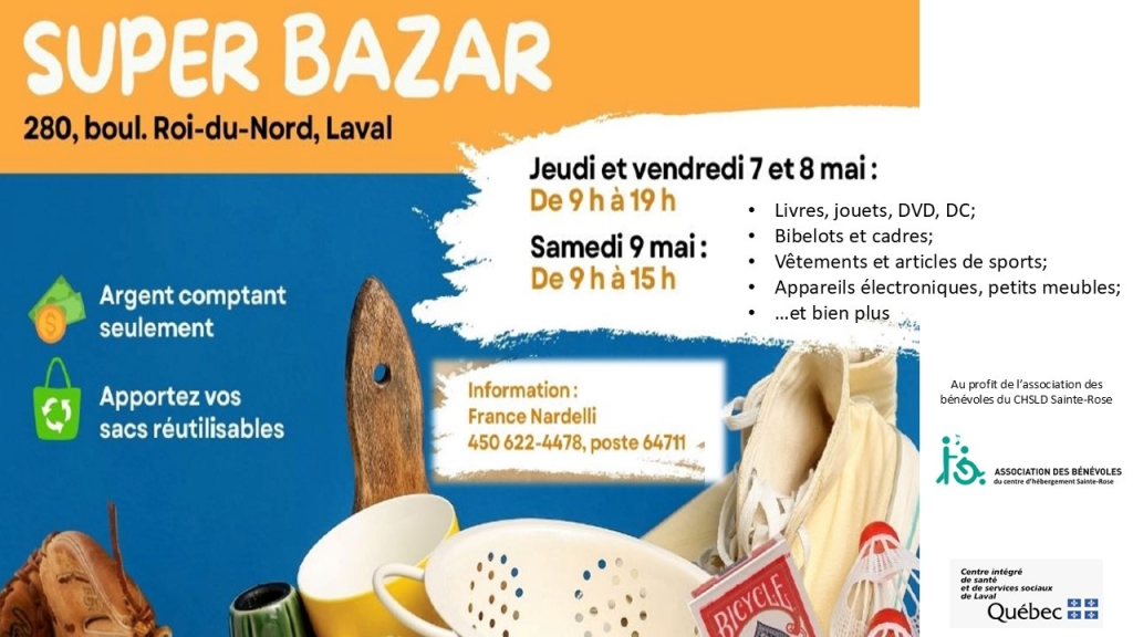 Venez vous approvisionner de vêtements pour hommes, femmes et enfants, jouets, livres, vaisselle, linge de maison, appareils électroniques et autres. Les profits seront remis à l’Association des bénévoles du centre d’hébergement Sainte-Rose.